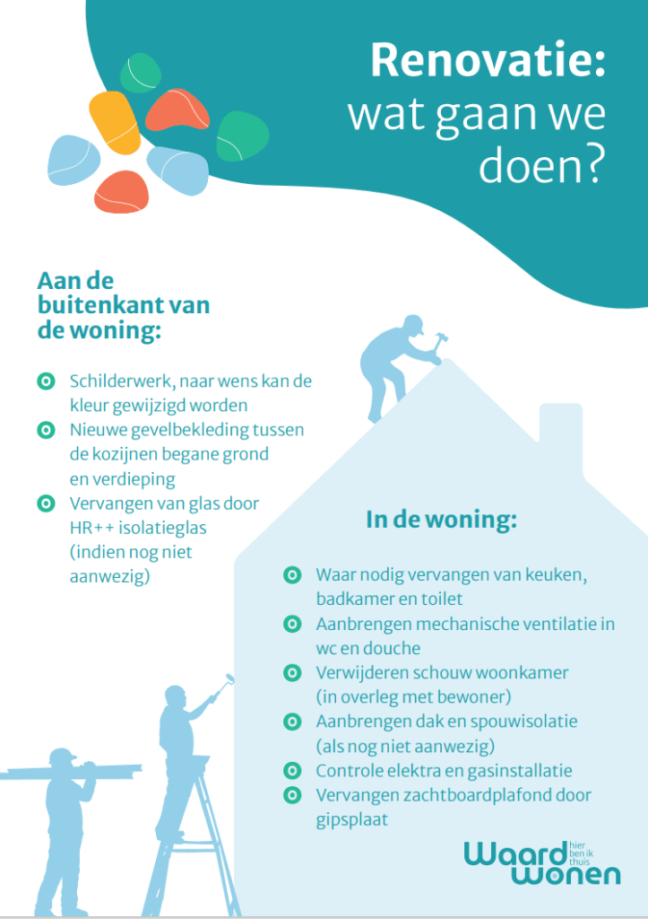 Ook zijn niet alle werkzaamheden in alle woningen nodig (bijvoorbeeld het vervangen van de keuken of douche). Voordat we de werkzaamheden starten weten we dit wel. Daarvan krijgt u vooraf de planning.